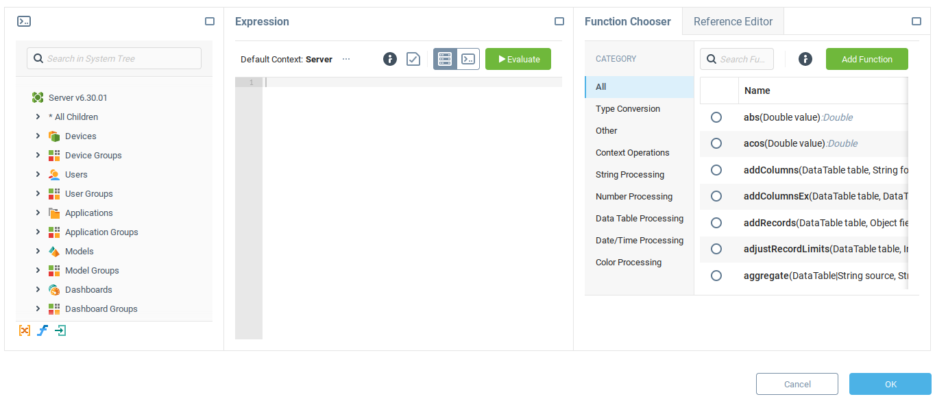 В конструкторе выражений есть переключатель, позволяющий выбрать, будут ли выражения, оцениваемые в редакторе, оцениваться на сервере () или в браузере (). Обратите внимание, что этот переключатель влияет только на оценку выражений в Конструкторе выражений. Выражения в производстве (например, в привязке или выражении валидности) в основном оцениваются на сервере, и только в некоторых случаях вычисление производится в браузере.